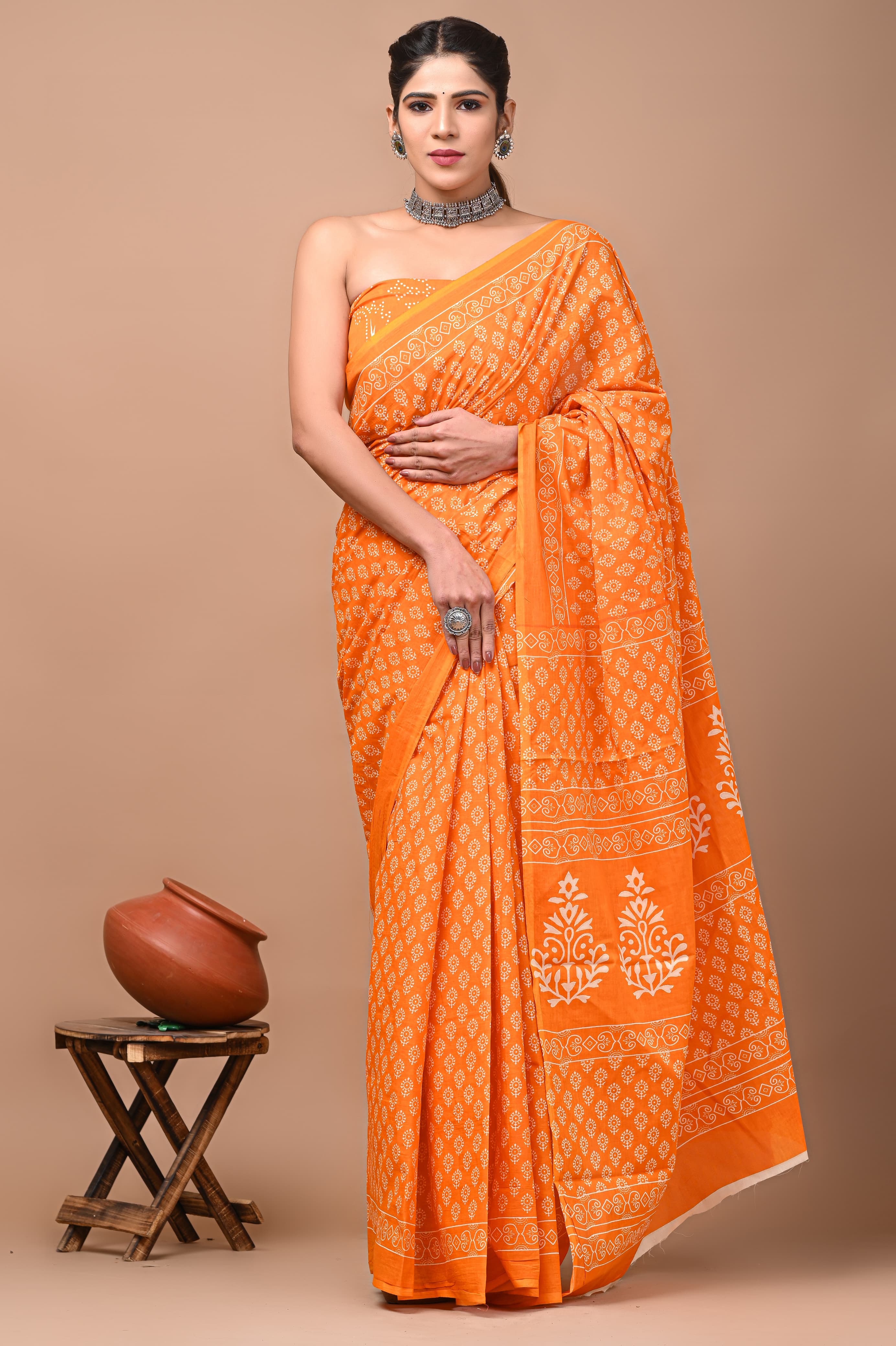 Cotton Mulmul Hand Block Booti Orange Saree