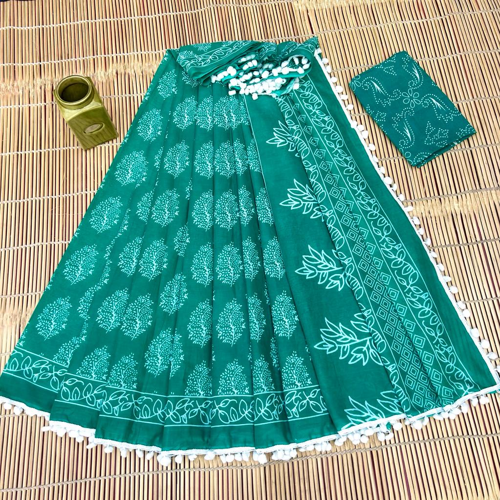 Cotton Mulmul Hand Block Green Print Saree