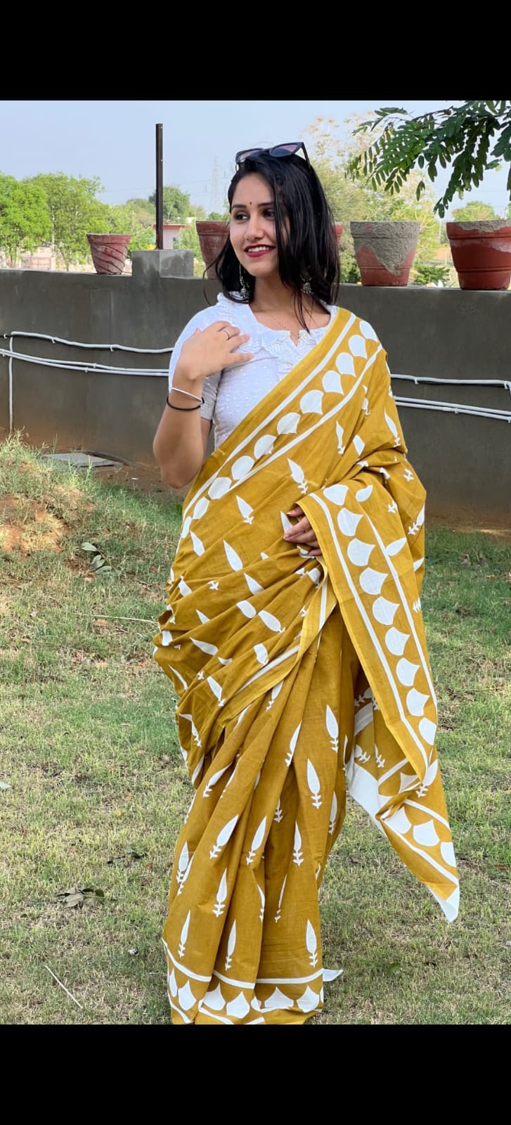 Cotton Mulmul Hand Block Yellow Votive Saree